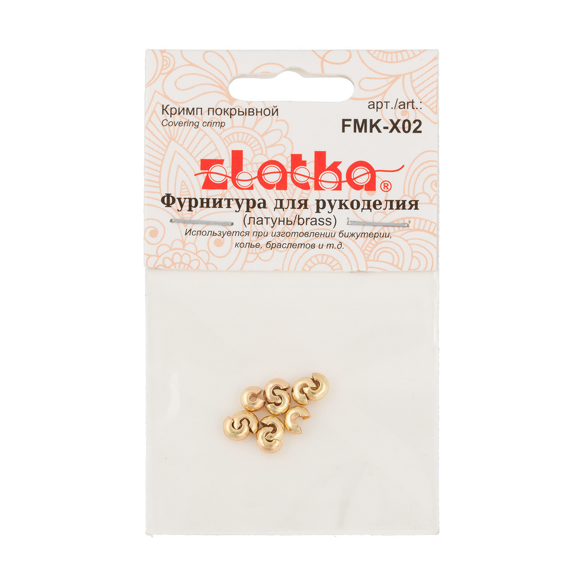 Кримп покрывной " Zlatka" FMK- X02 - это вспомогательный элемент фурнитуры, с помощью которого можно маскировать узелки на леске, ювелирном тросике, а также обычные кримпы фиксаторы. Наложив покрывной кримп на узелок, аккуратно сжимаем его края плоскогубцами , получаем на месте узелка небольшую бусинку. После использования покрывного кримпа изделие приобретает более изящный вид. Размер 5 х 3 мм. Количество в упаковке: 10 шт. Состав: латунь. Сообщить о неточности в описании